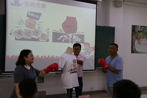 在第一阶段“学风建设大家说”中,张永刚副院长、邹佳锜副书记、团委书记刘洋老师,分别结合自己的本职工作,从解读校本科生考试违规处分细则、学院新制定的本科生请假制度、学院学风建设精品活动方案等方面谈了建设良好学风的积极意义,并对同学们今后的学风、考风提出明确要求。为了彰显学院进一步加强学风建设和严抓考风考纪的决心,校院两级教师代表以富有体育特色的形式——“打击作弊,重拳出击”向在场的全体同学发出警示,希望学生们杜绝考试作弊,建设良好学风,践行诚信考试。