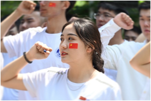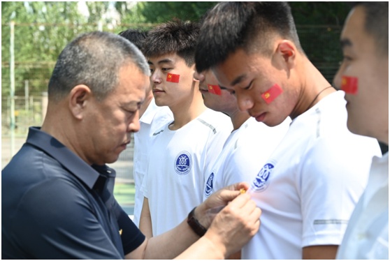 全体人员集合后,大家挥舞手中的小国旗,齐声高唱红色革命歌曲《没有共产党就没有新中国》,嘹亮的歌声映衬着同学们坚定的面容,每个人的思绪仿佛都被拉回到了那段峥嵘岁月。随后,老党员们为新党员佩戴建党100周年纪念徽章,阳光下熠熠生辉的徽章,既承载了希望,又饱含着鼓励。