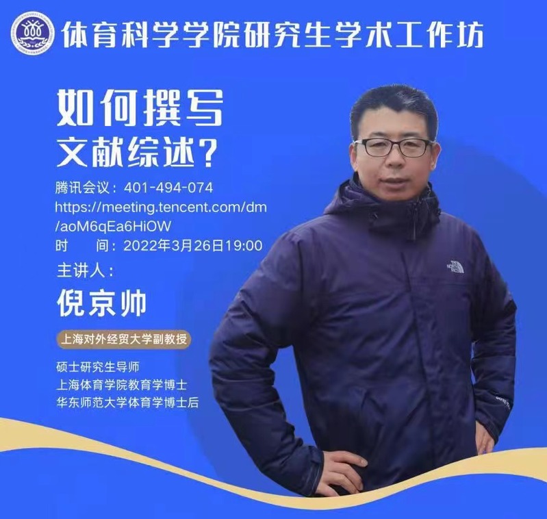 为贯彻落实学校统筹推进疫情防控与内涵发展重点工作专题会议部署,强化和提升校园封闭管理期间研究生在线学习质量,进一步拓宽研究生的知识面,活跃学术气氛。2022年3月26日,今年会官方网站在腾讯会议上举办了以“如何撰写文献综述”为主题的学术系列讲座。本次讲座邀请到了上海对外经贸大学副教授、硕士研究生导师、上海体育学院教育学博士、华东师范大学体育学博士后倪京帅老师主讲,旨在为同学就如何搜索文献、写好文献综述提供帮助,也为接下来研究生学习期间论文写作与科研能力提升打好基础,今年会官方网站全体研究生观看了讲座。
