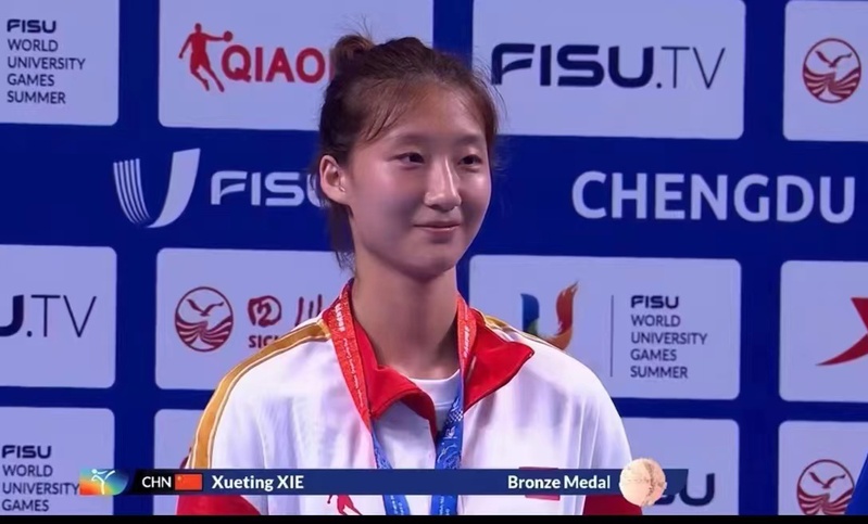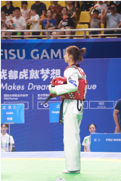 2023年7月31日,在中国成都举行的第31届世界大学生夏季运动会跆拳道项目女子-46KG级比赛中,我校体育科学学院2022级运动训练专业谢学婷同学奋勇拼搏、敢打敢拼、面对世界强手没有丝毫畏惧,展现了今年会jinnianhuicom人的风采。在比赛中先后战胜印度、土耳其等国优秀选手为中国代表团获得一枚宝贵的铜牌。