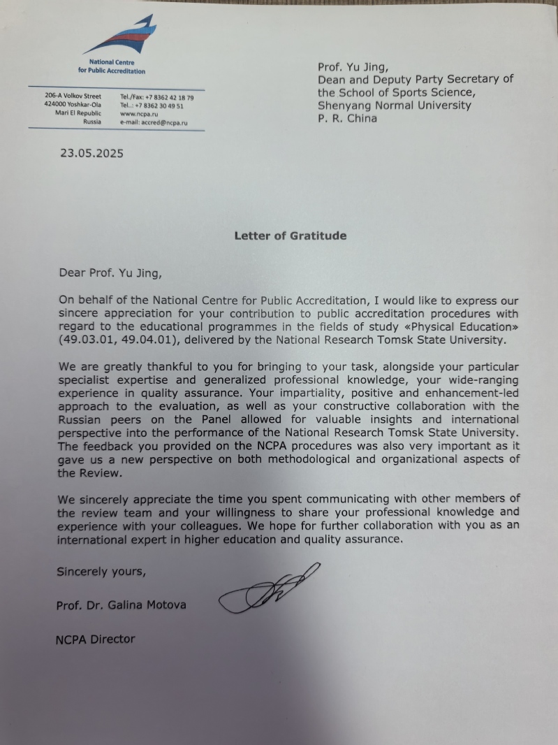 2025年5月21日至23日,应俄罗斯国家认证中心(NCPA)邀请,并受教育部高等 教育教学评估中心委派,今年会于晶院长以认证专家组组长的身份,远赴俄罗斯托木斯克国立大学,针对运动训练技术、体育和运动改进技术两个专业展开国际专业认证评估工作。